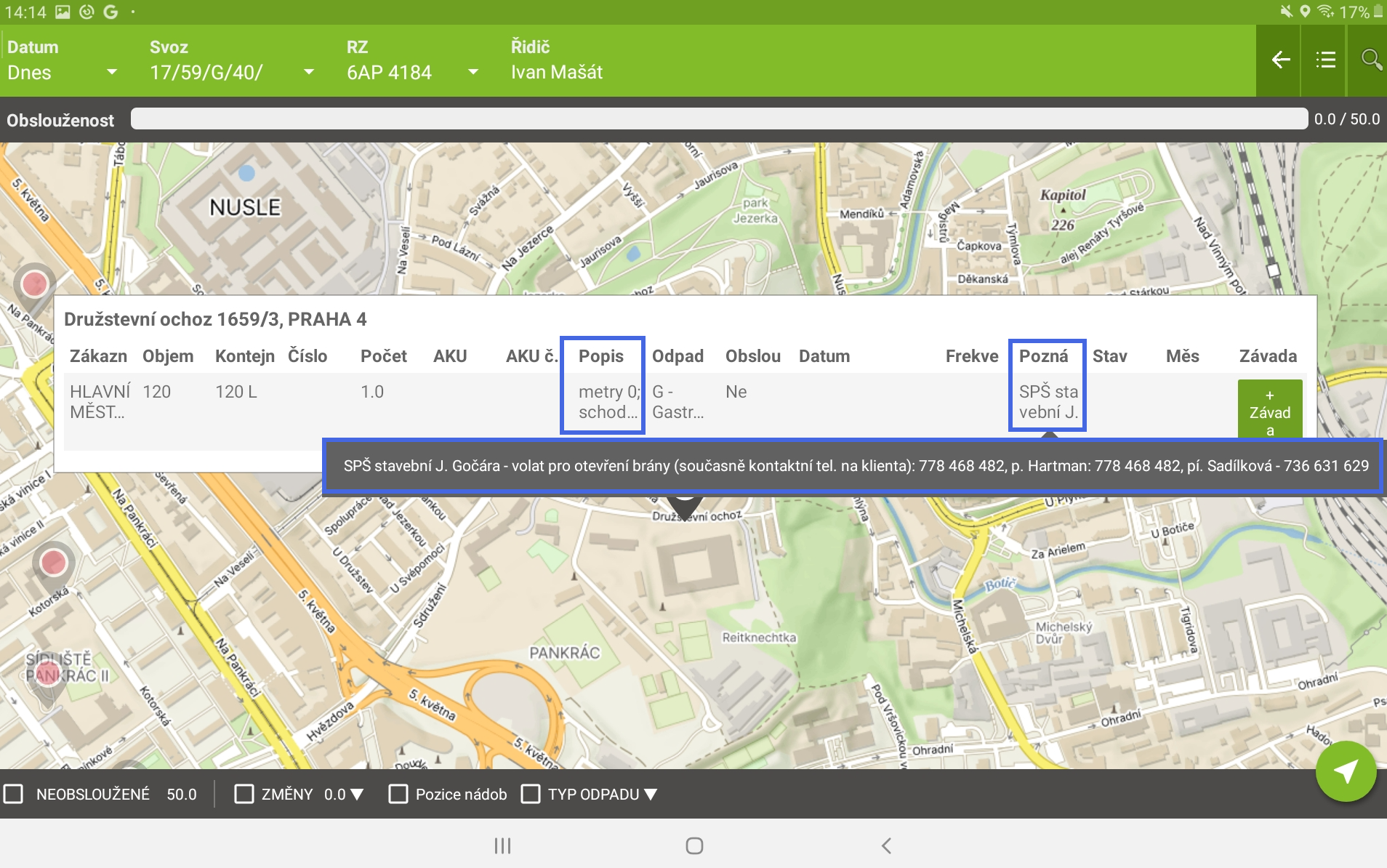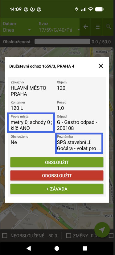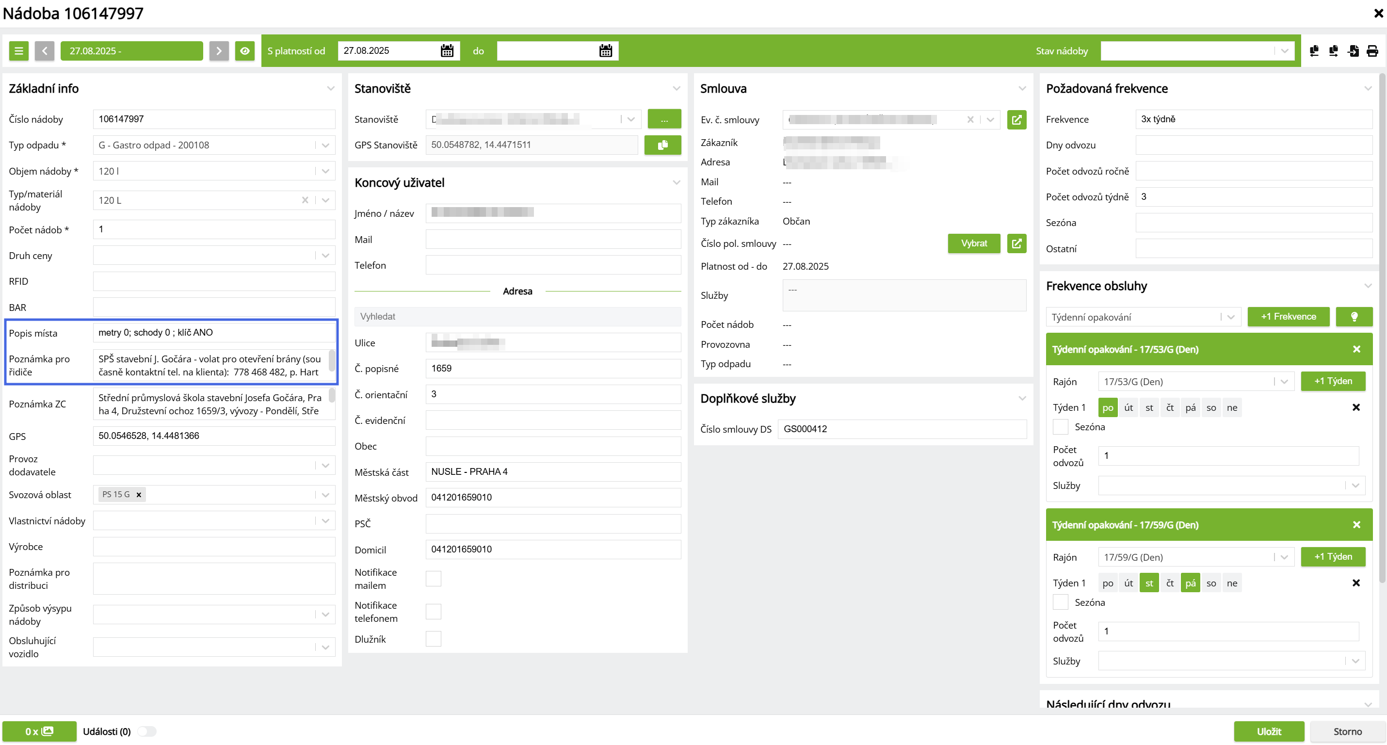 K nádobě na svozu přidaná pole Poznámka pro řidiče a Popis místa