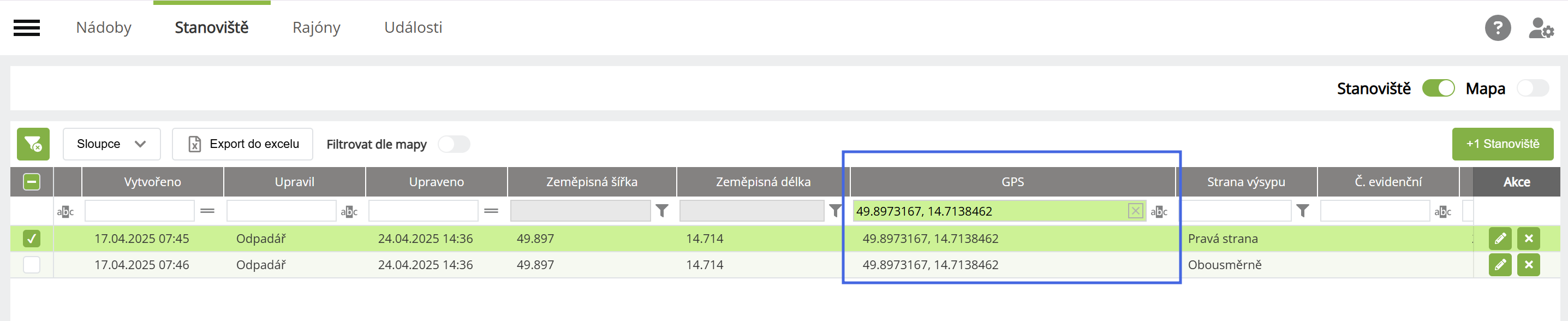 Filtrování ve sloupci GPS v přehledu stanovišť