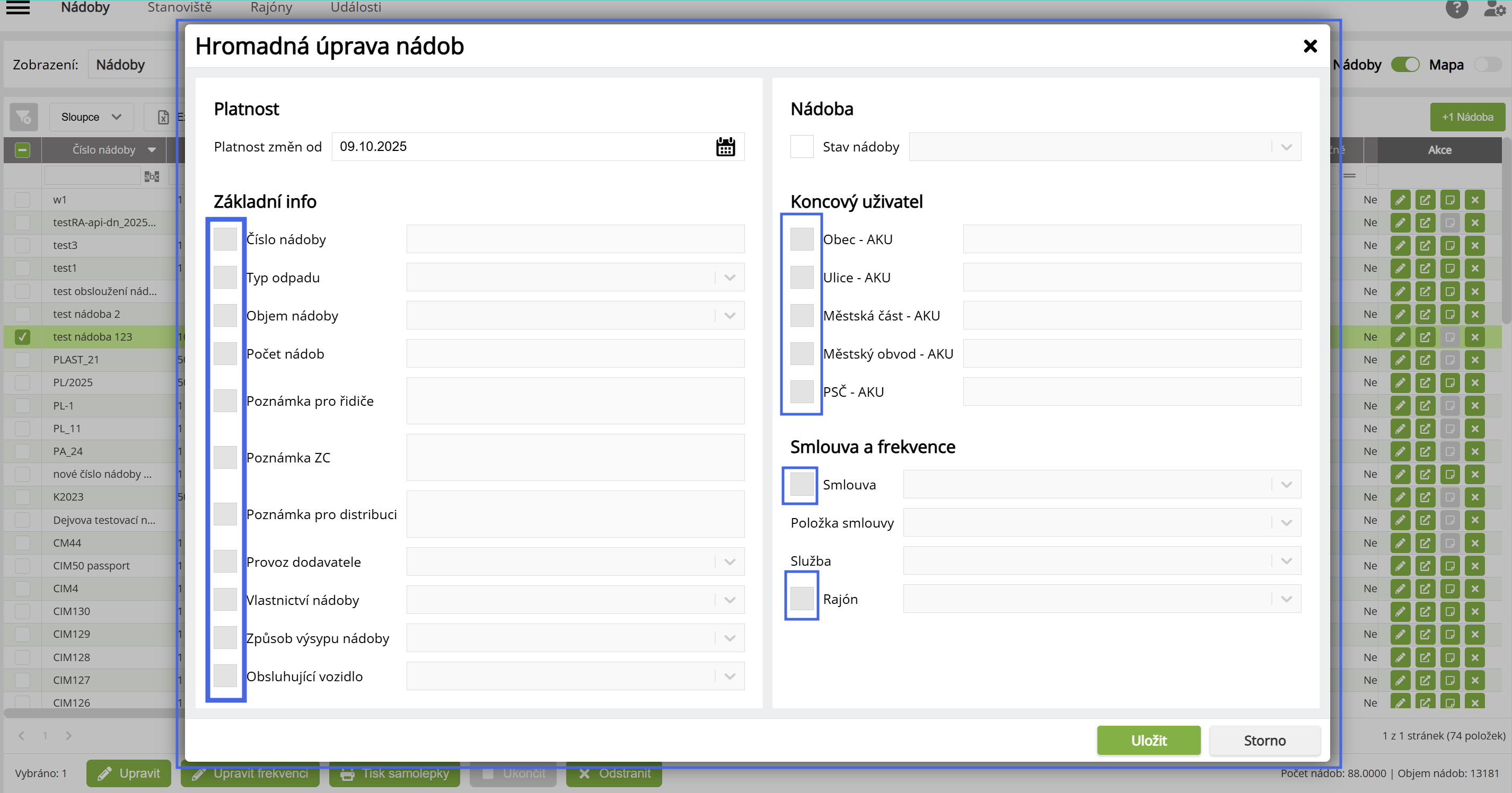 Vybraný parametr lze ze svozů i odebrat, a to zaškrtnutím checkboxu a nevybráním žádné položky z dropdownu.