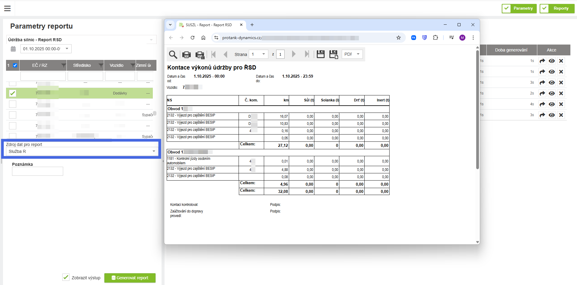 Současně zůstává zachována možnost zobrazit i původně odeslaná data. Této funkcionality bylo dosaženo přidáním nového přepínače umístěného pod tabulkou vozidel, který umožňuje volbu mezi více zdrojovými daty. Pro zobrazení reportu s daty exportovanými do ŘSD je nutné zvolit možnost „Služba R“.