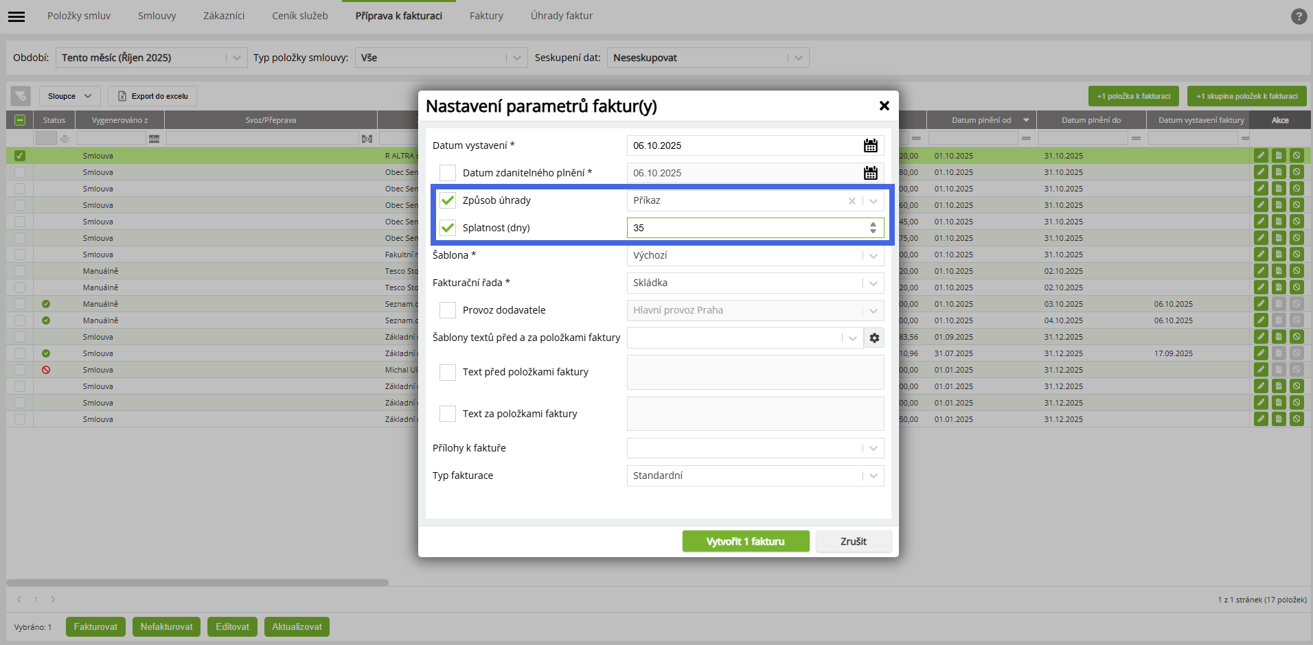 Tento dialog nově obsahuje dvě další možnosti, které umožňují přetížit výchozí nastavení ze smlouvy – pole Splatnost a Způsob úhrady.