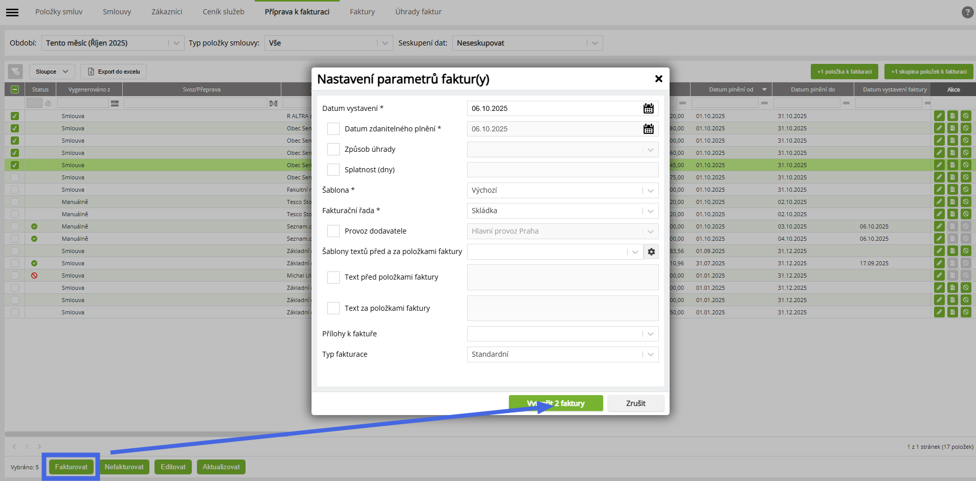 Po kliknutí na tlačítko Fakturovat v modulu Příprava k fakturaci se zobrazí dialogové okno s možností dílčích úprav před odesláním položek k fakturaci. Novinkou v tomto okně je zobrazení informace o počtu faktur, které vzniknou na základě uživatelského výběru.