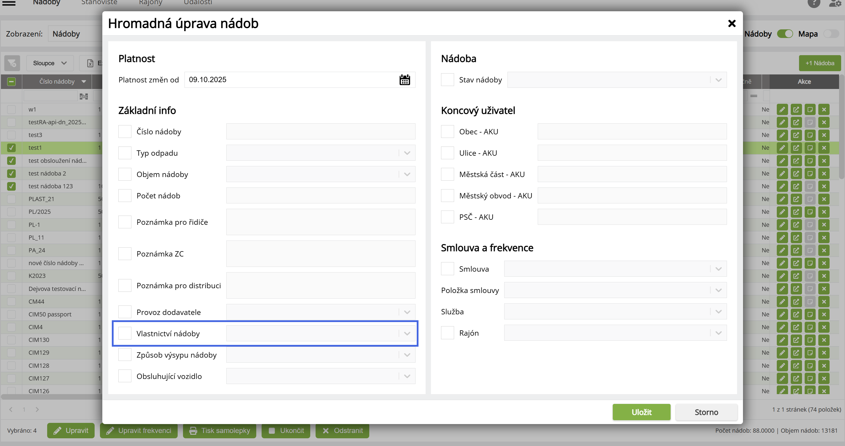 Do hromadné úpravy v zobrazení "Nádoby" a "Časové řezy" byla přidána nová položka pro hromadnou editaci - "Vlastnictví nádoby".