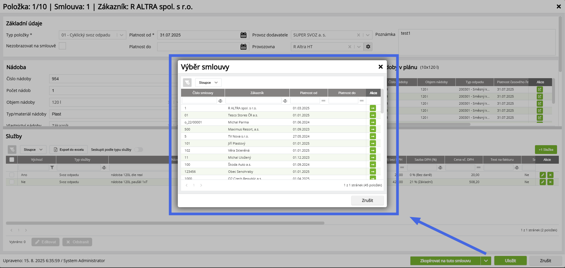 - Pokud je smlouva nebo položka smlouvy smazaná, zůstává zobrazena u dané nádoby/řezu.
