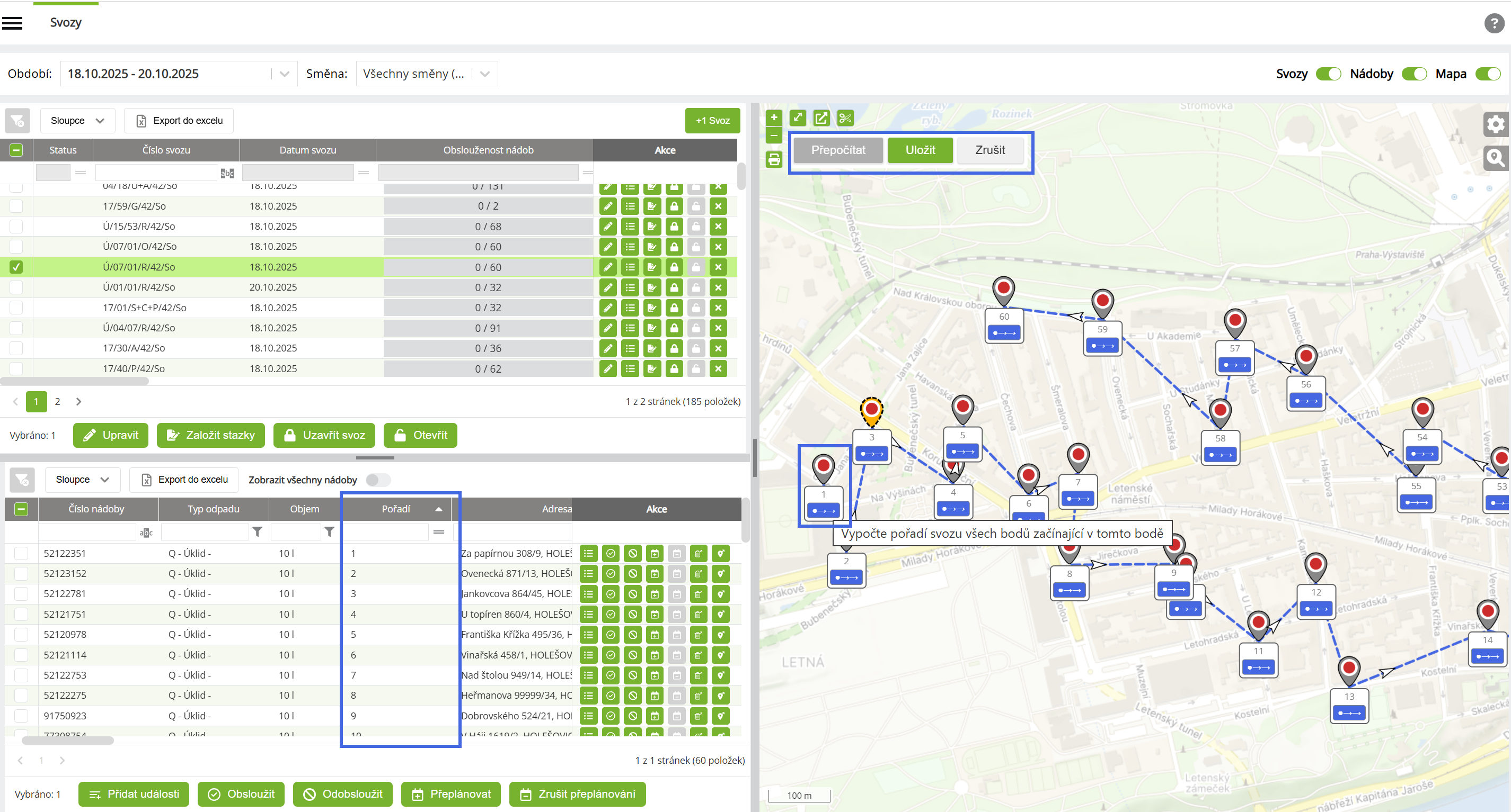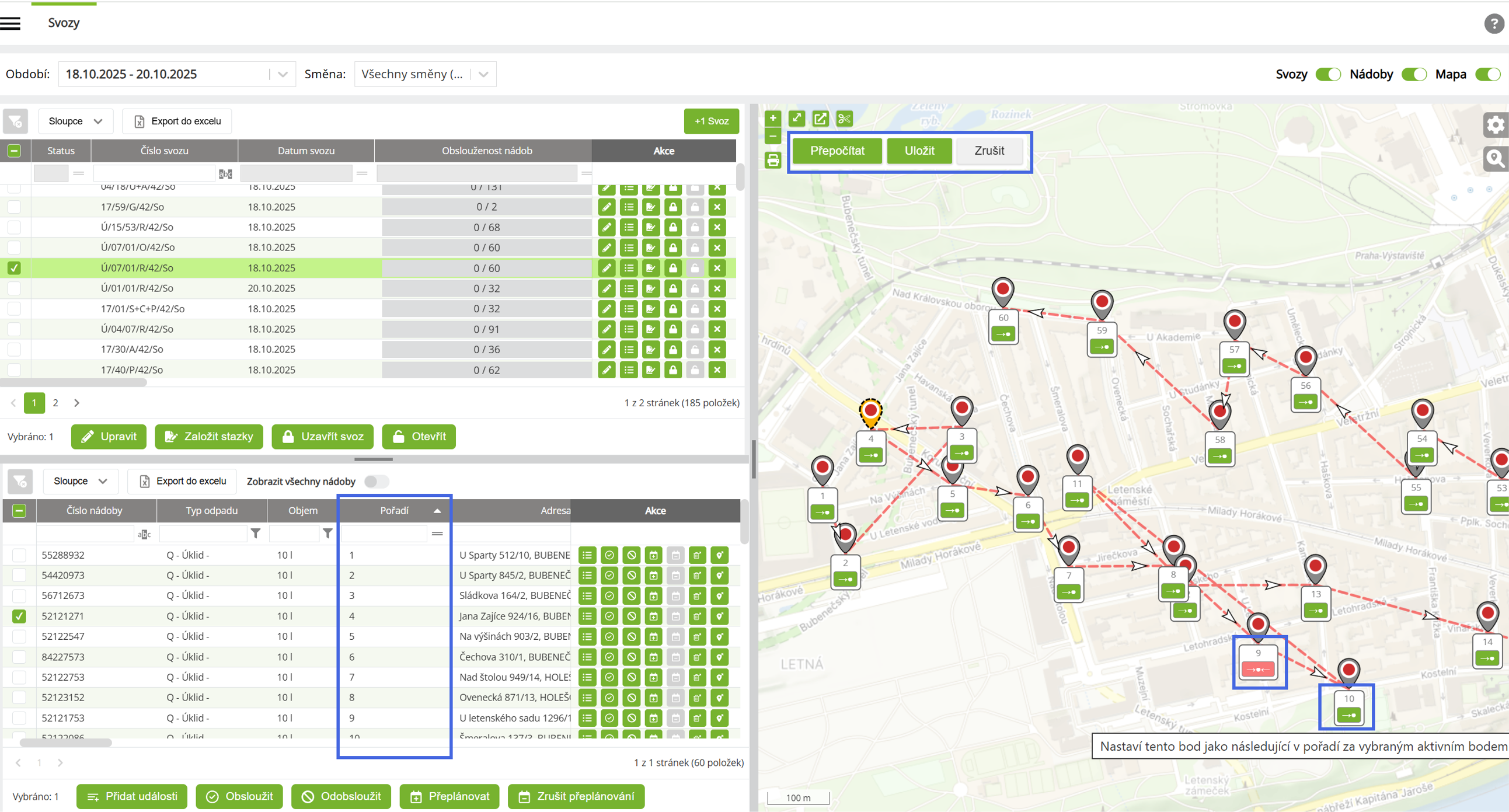 - Systém automaticky přepočítá pořadí všech nádob na svozu