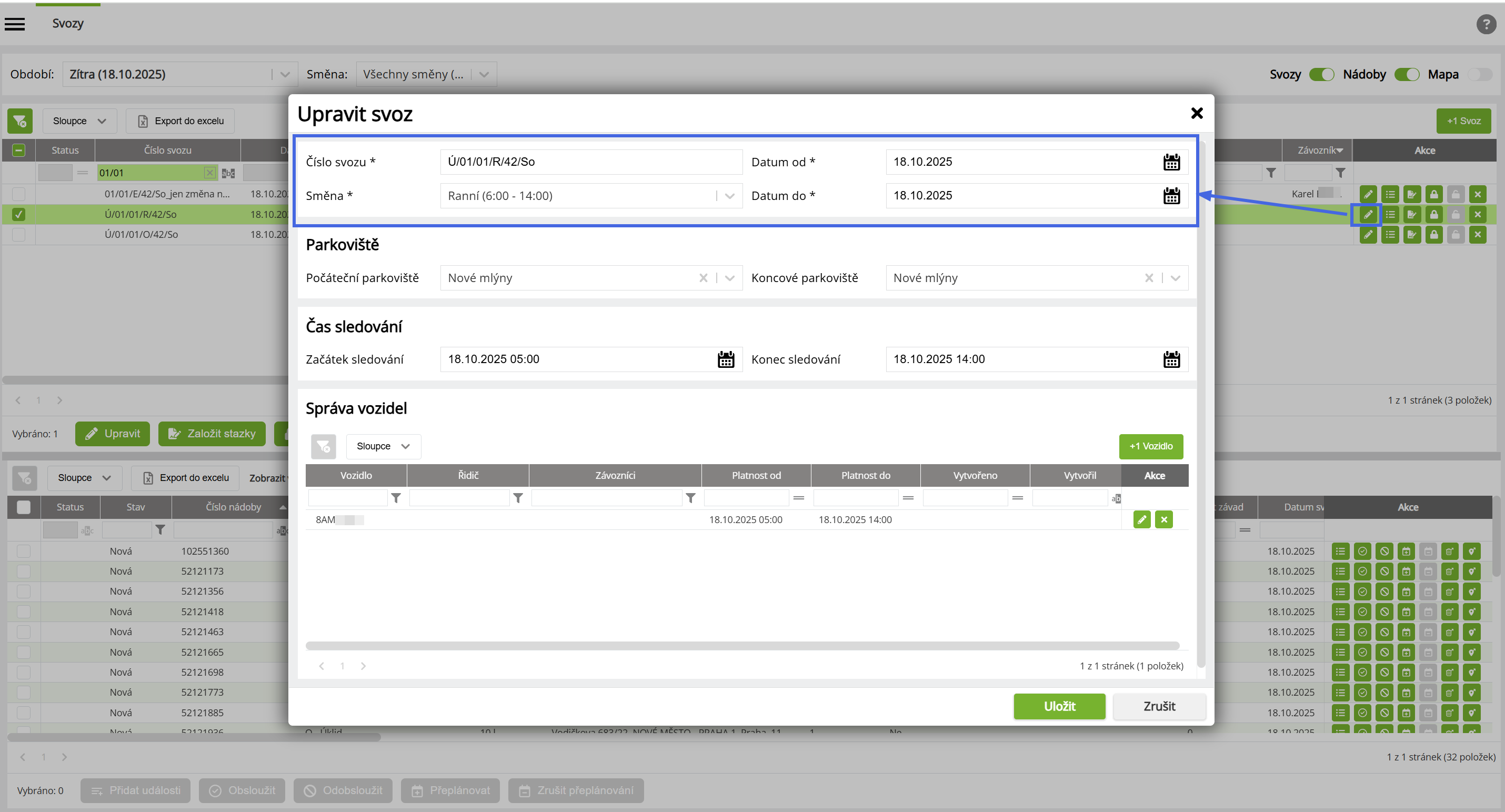 Možnost editace čísla svozu, směny a datumů platnosti svozu
