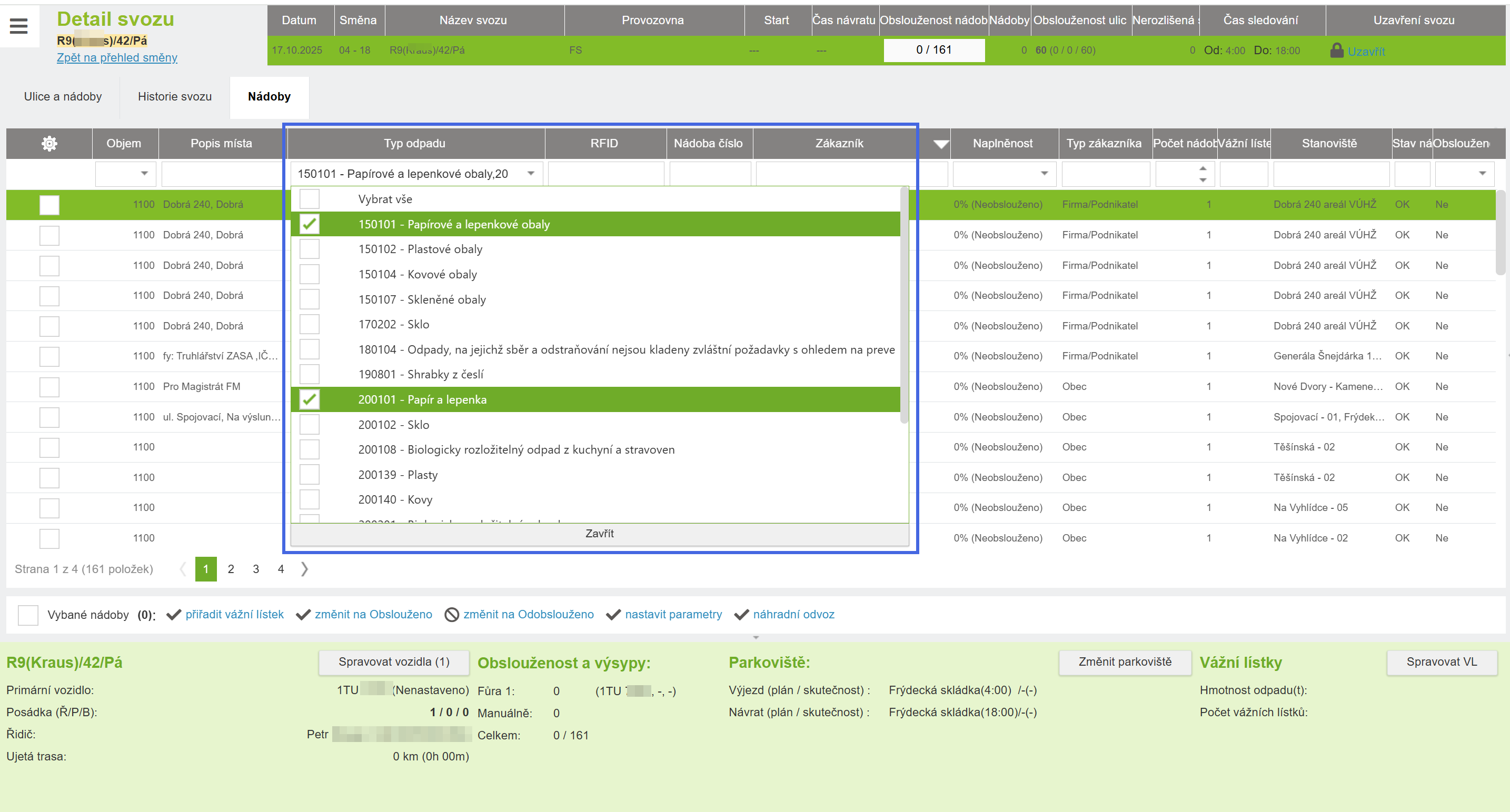 V detailu svozu na záložce Nádoby byl u sloupečků "Typ odpadu" a "Objem" změněn typ filtru na token box. Je tak možné pomocí checkboxu vybrat více hodnot najednou.