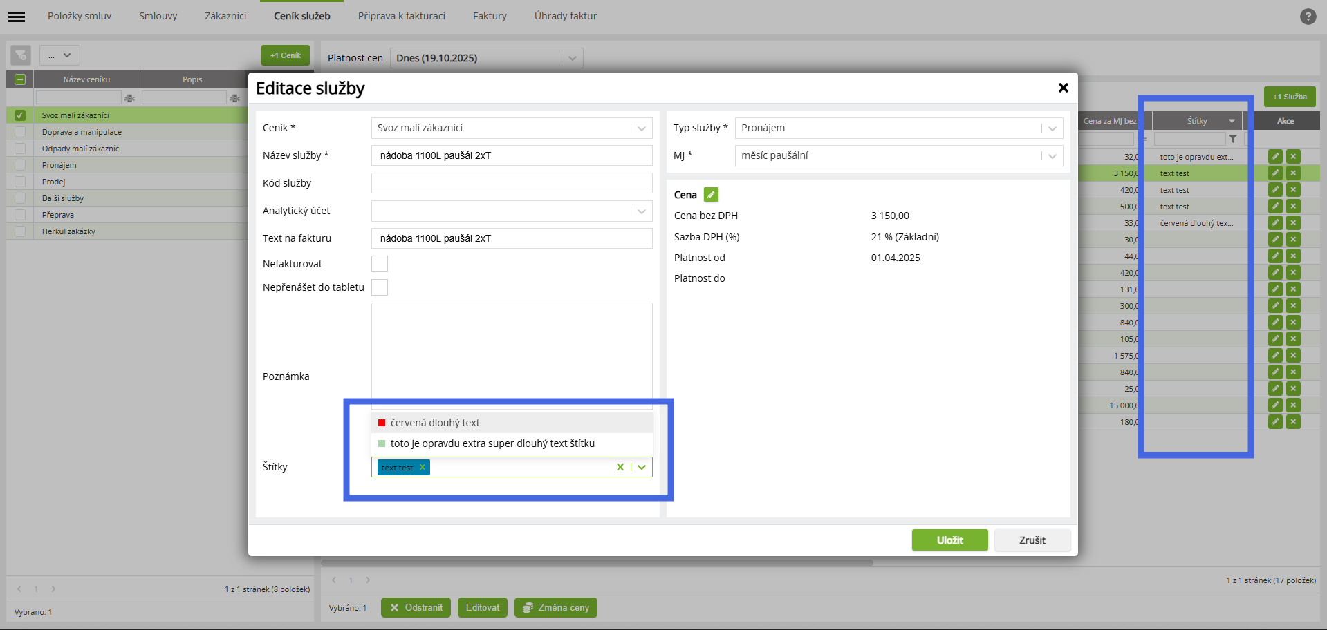 Do Ceníku služeb byla doplněna možnost přidávat a zobrazovat štítky u jednotlivých služeb. Tato funkce umožňuje uživatelům rychleji identifikovat, filtrovat a seskupovat služby podle zvolených kategorií či vlastností.