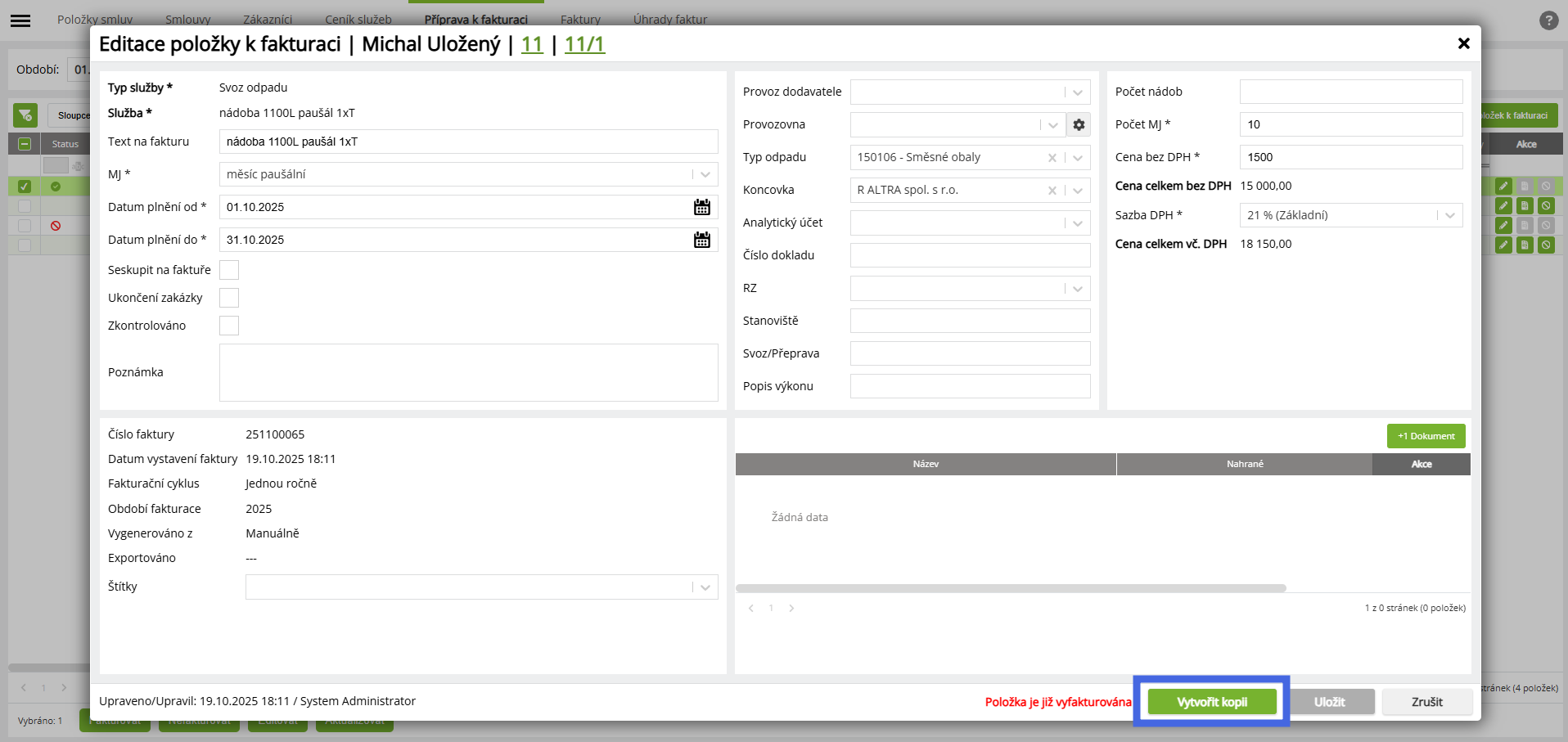 U položek k fakturaci, které jsou již vyfakturované, je nyní možné použít tlačítko „Vytvořit kopii“. Dosud bylo toto tlačítko neaktivní, i když samotnou položku bylo možné zobrazit.