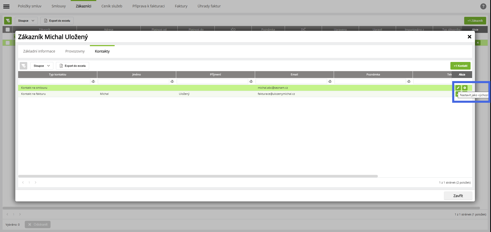 - Každý typ kontaktu u Zákazníka může být označen jako „Výchozí“ záznam. První přidaný kontakt daného typu je automaticky výchozí. Výchozí lze později změnit pomocí tlačítka „Změnit na výchozí“ v přehledu kontaktů.