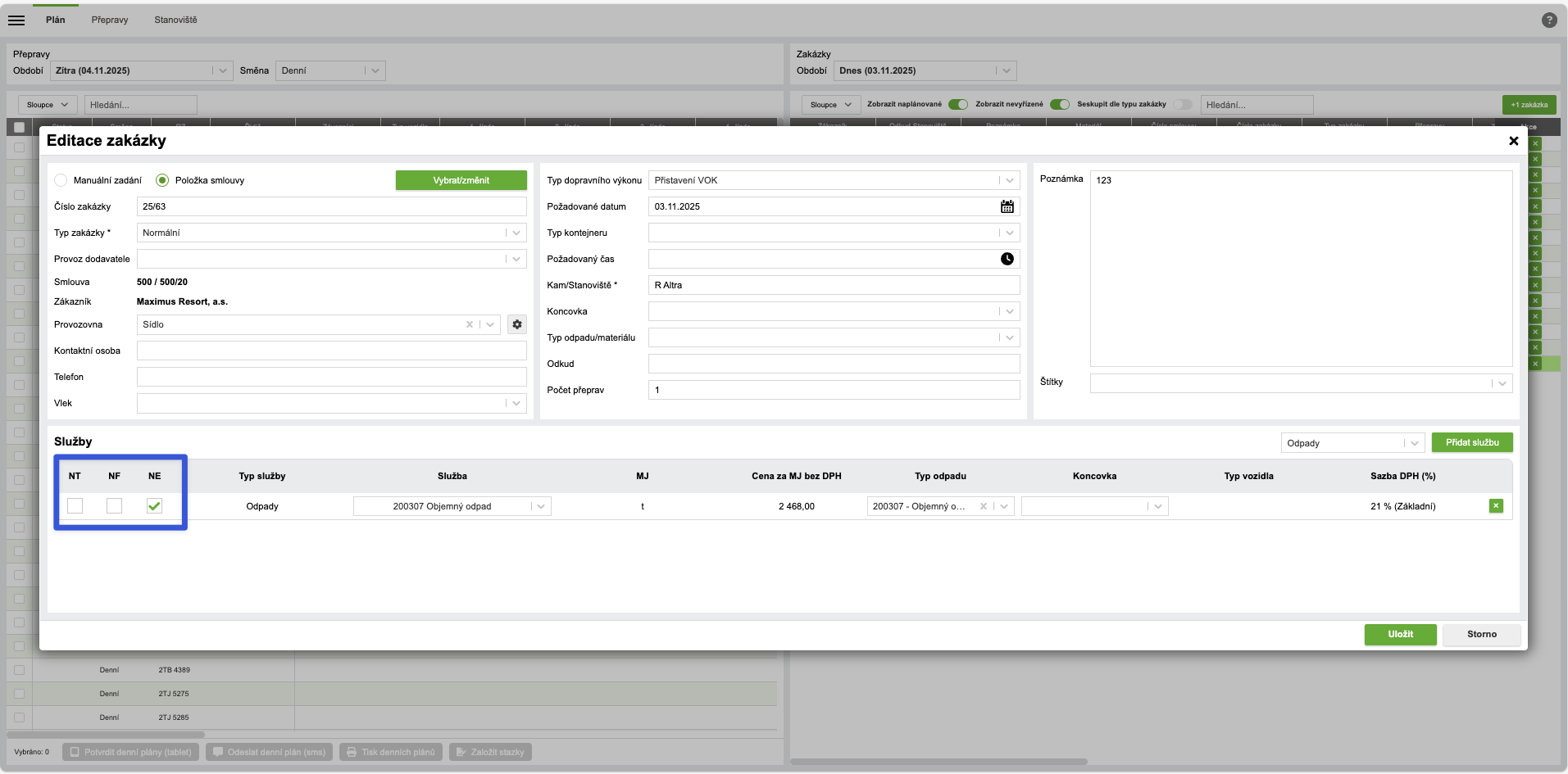 Checkboxy NT a NF se při uživatelském přidání nevýchozí služby na zakázce nebo přepravě nyní nastaví podle nastavení na položce smlouvy, ze které je zakázka/přeprava vytvořena.