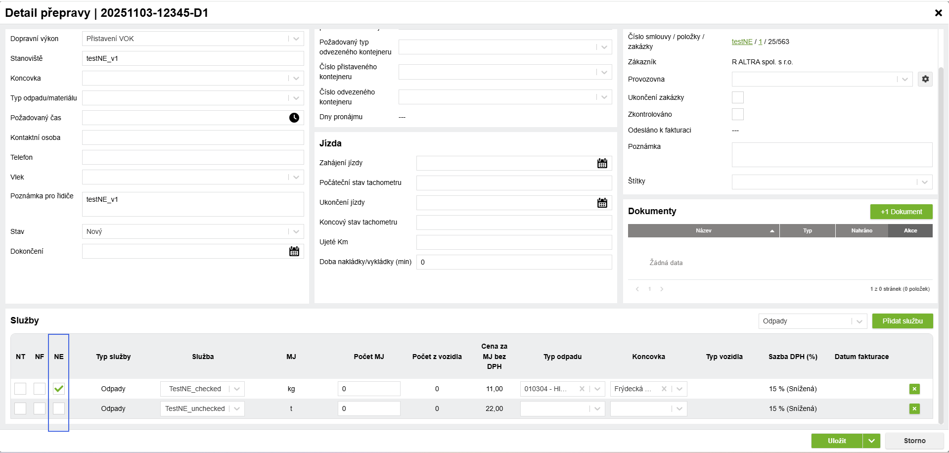 Modul Přeprava nově zobrazuje a umožňuje editaci exkluzivity „Nezahrnout do evidence (NE)“ u služeb na zakázce i přepravě.