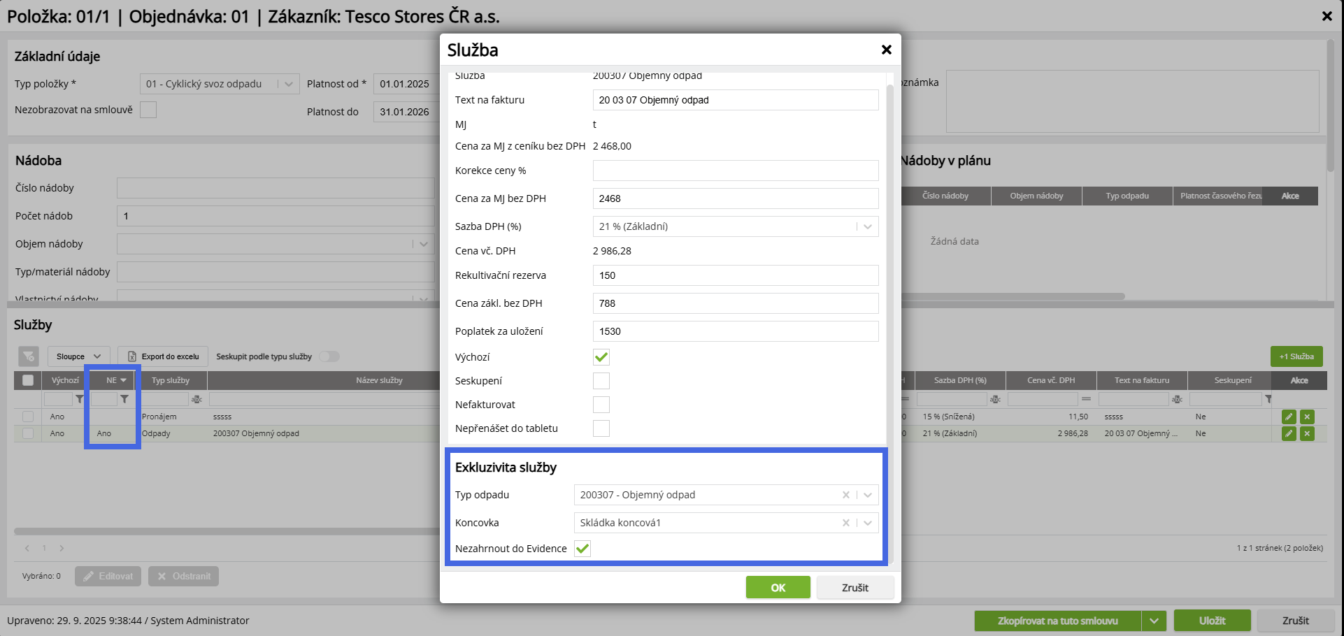 Exkluzivita „Nezahrnout do Evidence“ a možnost editace dalších exluzivit pro na Položce smlouvy