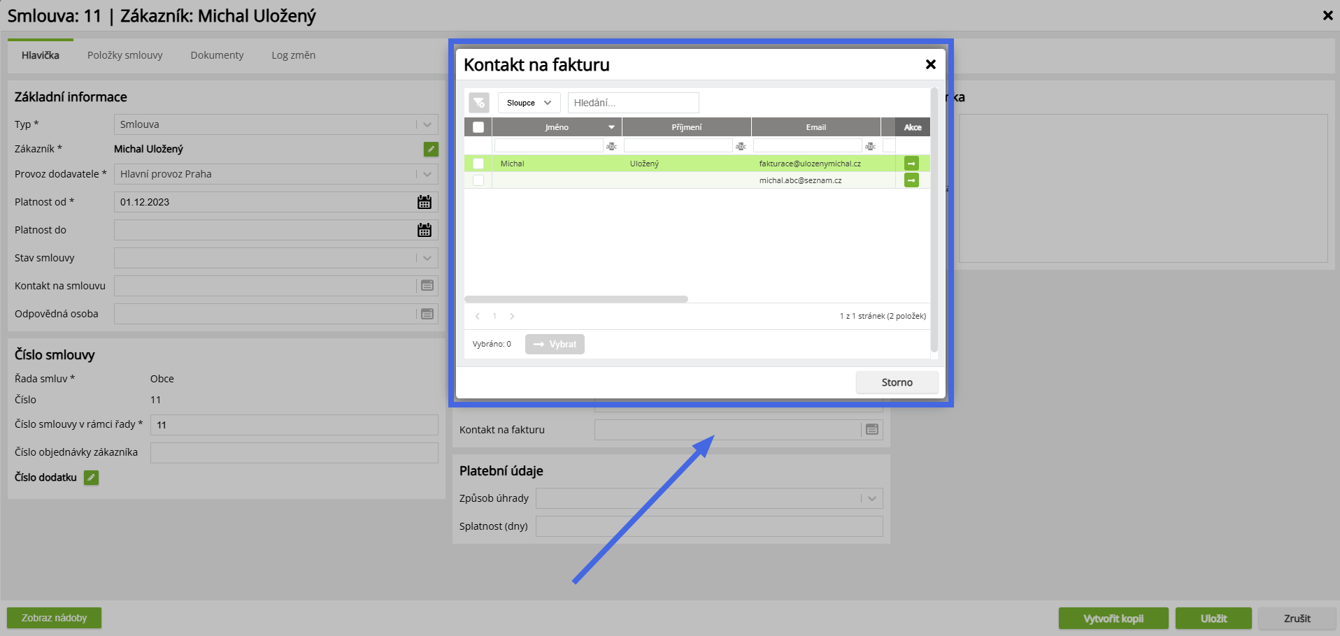 - Pokud nejsou na smlouvě uvedeny, použijí se výchozí kontakty z karty zákazníka.