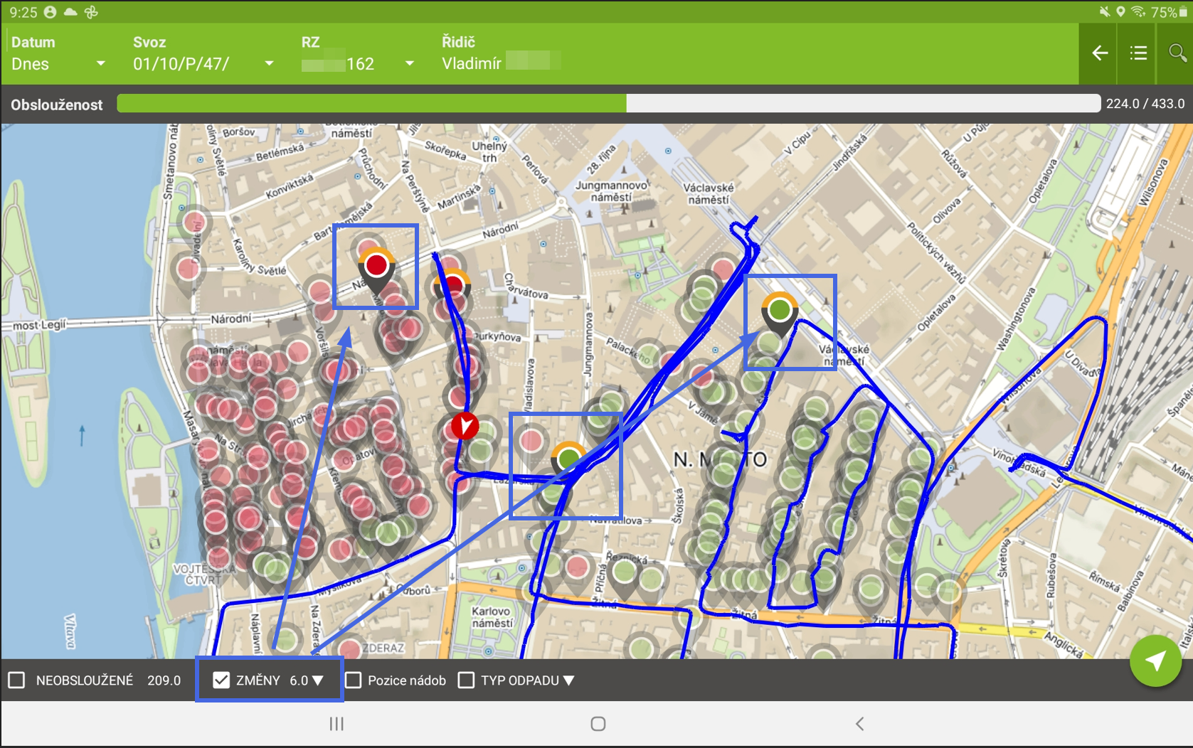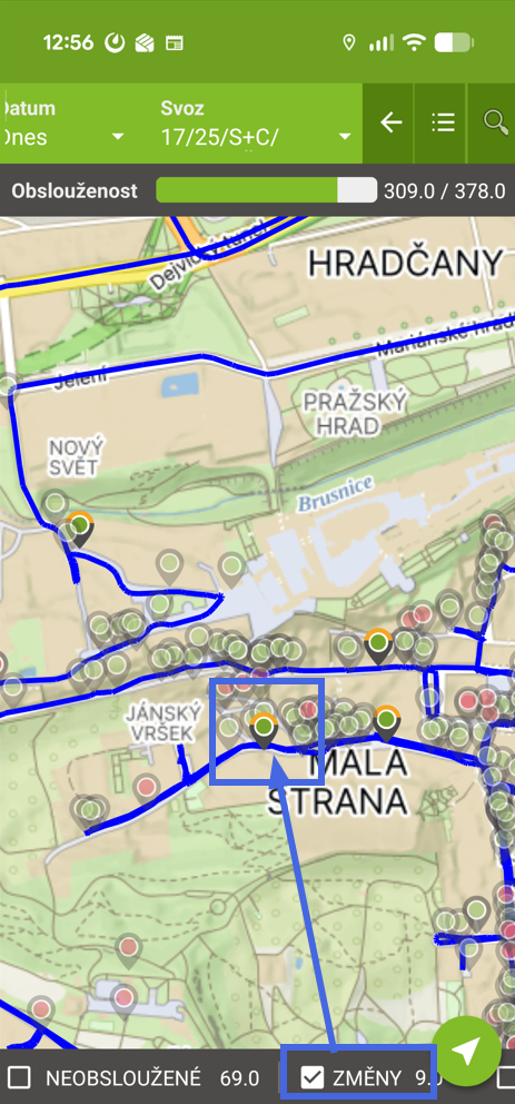 Nově přidané nádoby do již vygenerovaného svozu nebo nádoby, které byly po přidání do svozu upravené, je nyní možné v mobilní aplikaci zvýraznit. Po kliknutí na checkbox Změny se původní nádoby upozadí a nově přidané nebo editované zůstanou zvýrazněné a jsou barevně odlišené (žluý horní okraj kapky).