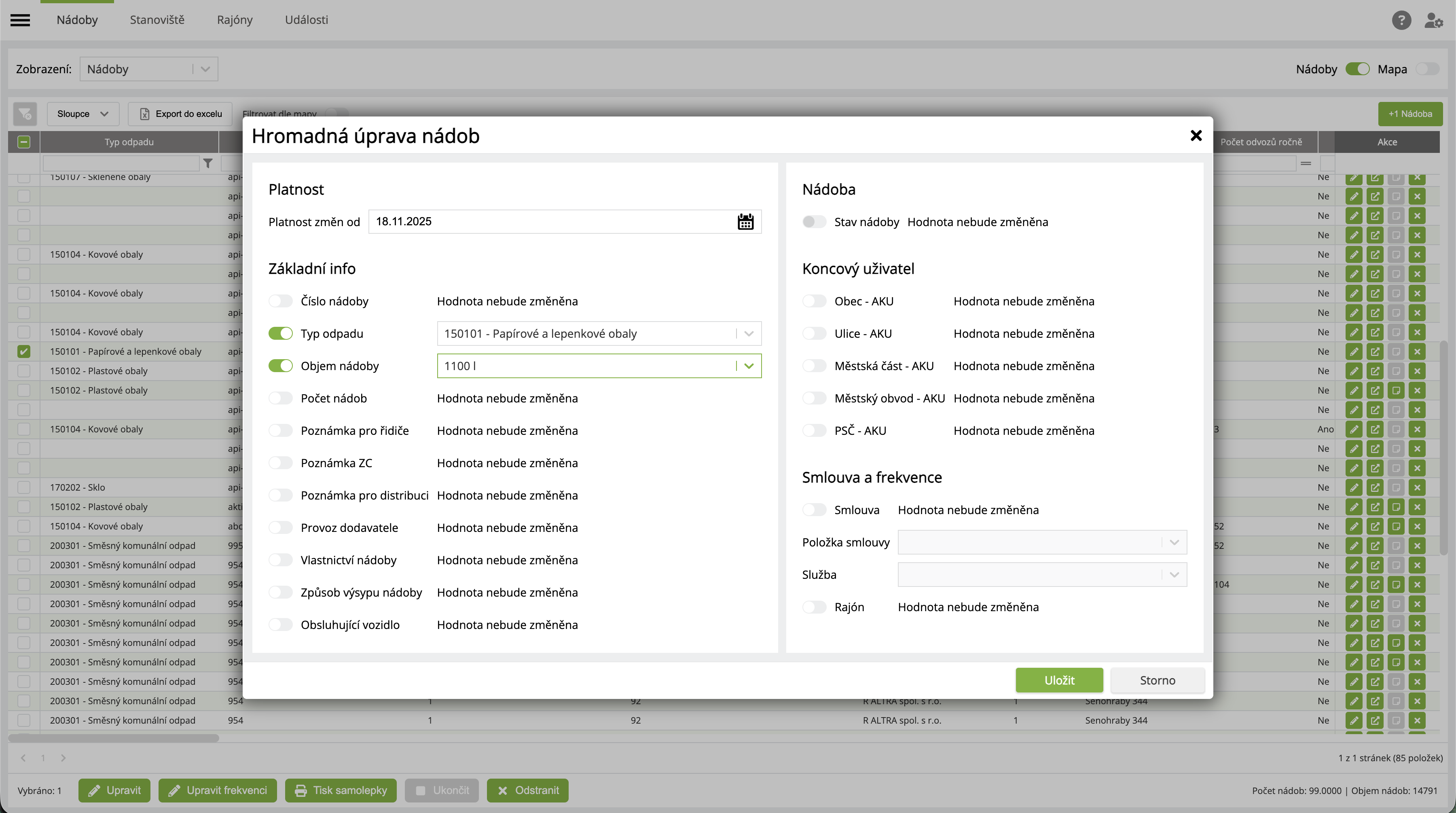 Zvýraznění nádob nově přidaných do svozu nebo editovaných nádob