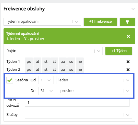 Zadání sezónosti ve Frekvenci obsluhy u nádoby nebo v hromadné úpravě frekvence se po zaškrtnutí Sezóny nově zobrazí dvouřádkově. Parametr zadání sezóny Od a pod ním parametr zadání sezóny Do.